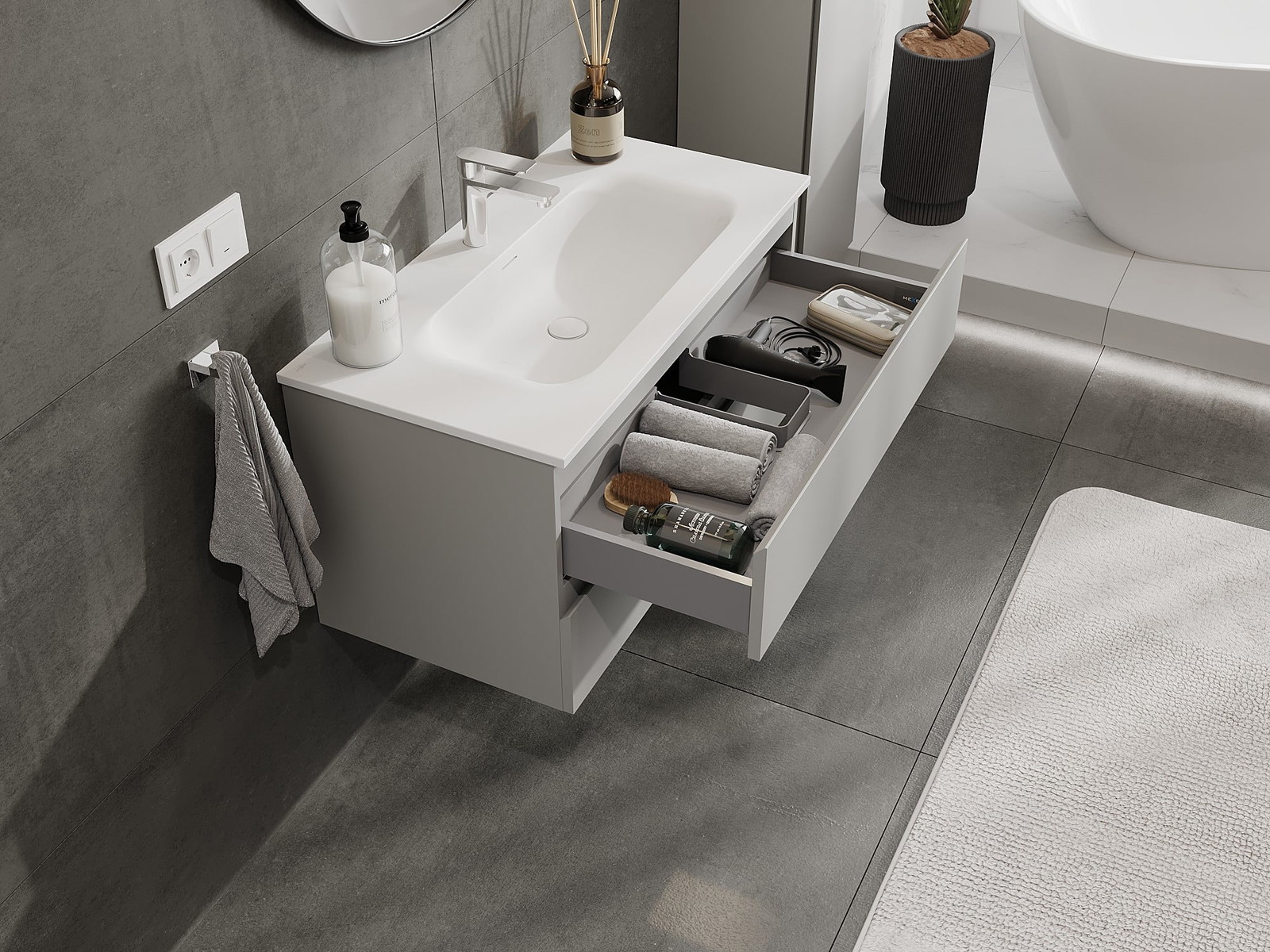 Izgriezums atvilktnē ir veidots tā, lai tajā varētu ietilpt sifons, kas ir nepieciešams izlietņu uzstādīšanā. Pateicoties tam, mēbele var tikt pilnībā funkcionāli uzstādīta, neatstājot ievērojamu vietu atvilktnē instalācijai.