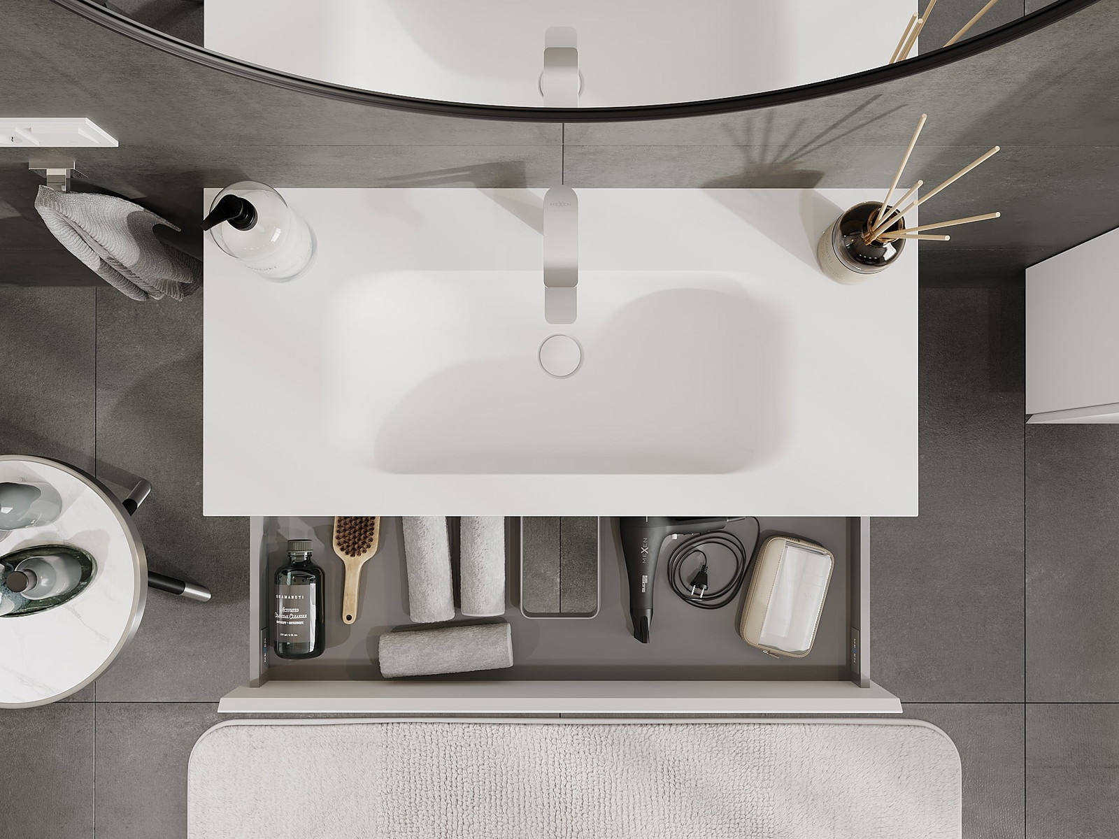 Izgriezums atvilktnē ir veidots tā, lai tajā varētu ietilpt sifons, kas ir nepieciešams izlietņu uzstādīšanā. Pateicoties tam, mēbele var tikt pilnībā funkcionāli uzstādīta, neatstājot ievērojamu vietu atvilktnē instalācijai.