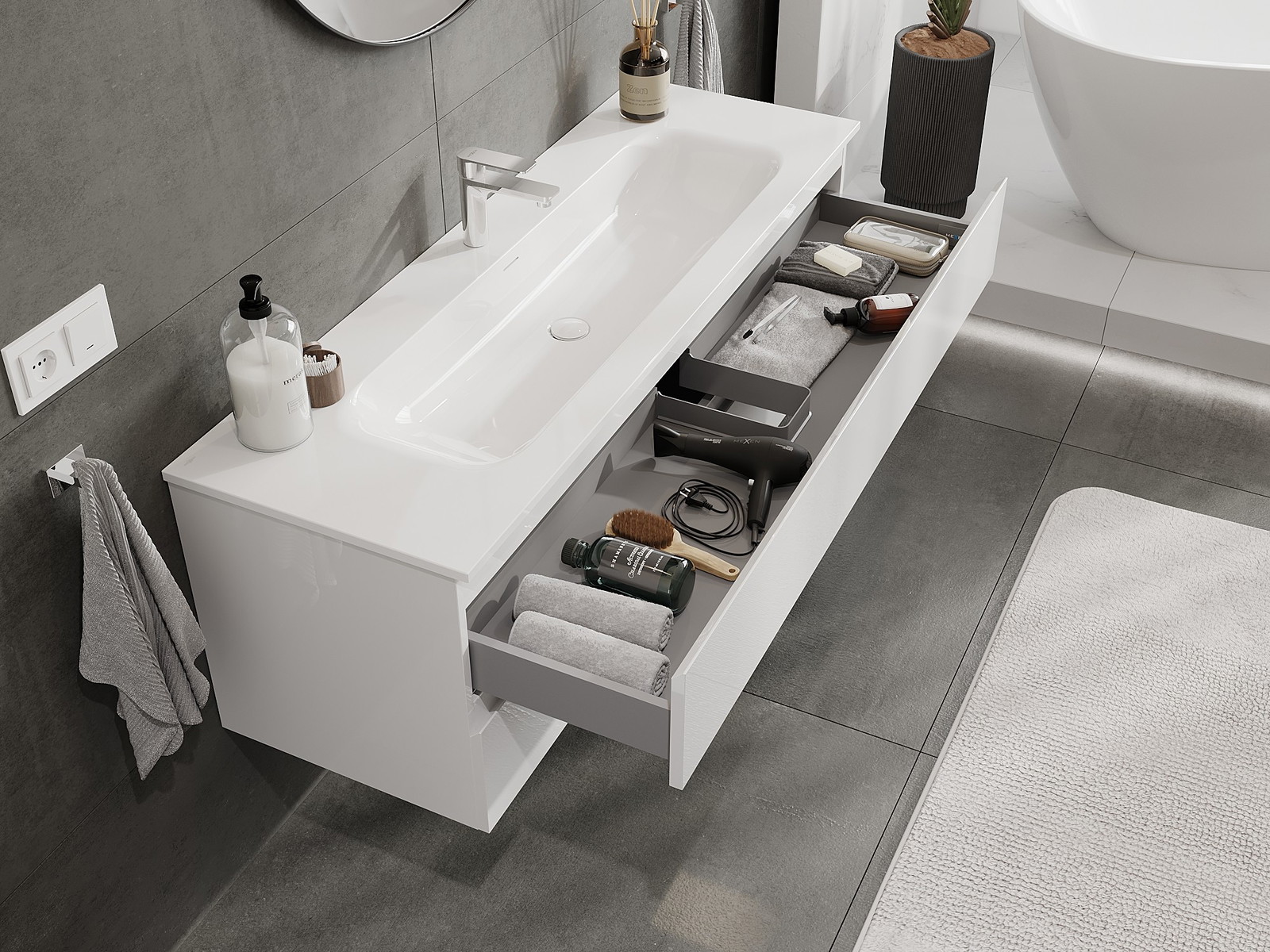 Izgriezums atvilktnē ir veidots tā, lai tajā varētu ietilpt sifons, kas ir nepieciešams izlietņu uzstādīšanā. Pateicoties tam, mēbele var tikt pilnībā funkcionāli uzstādīta, neatstājot ievērojamu vietu atvilktnē instalācijai.