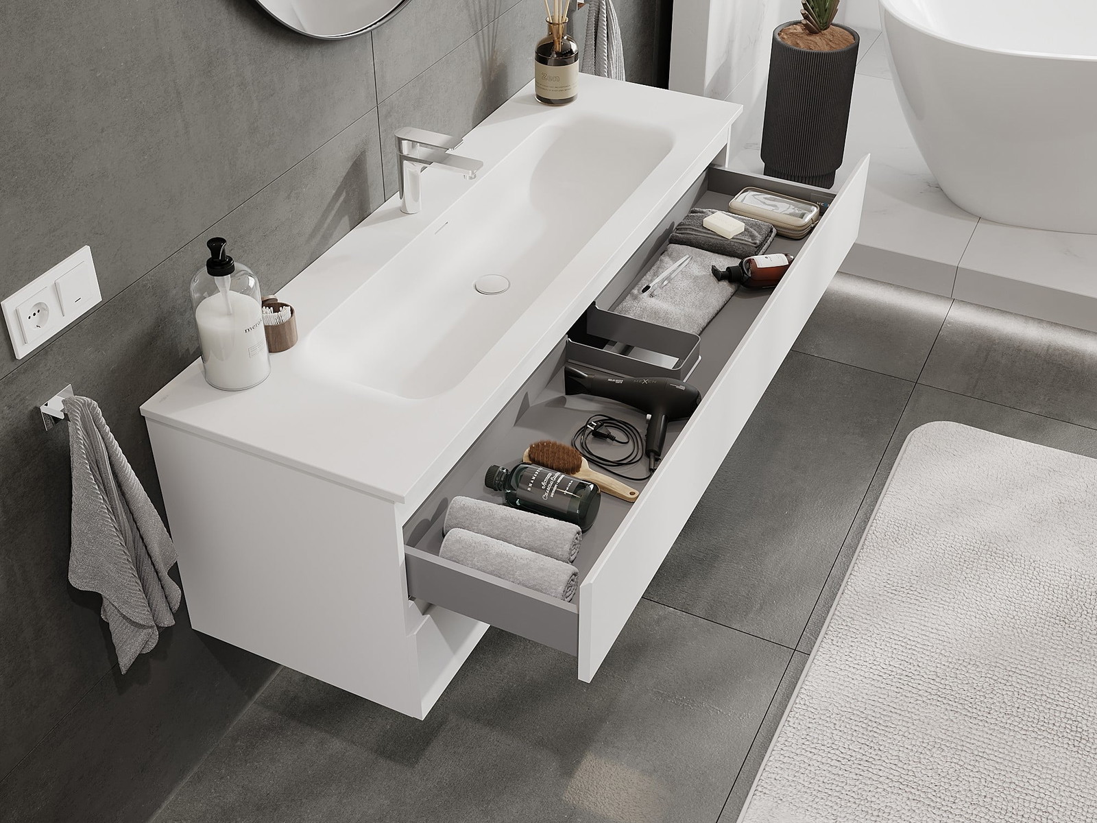 Izgriezums atvilktnē ir veidots tā, lai tajā varētu ietilpt sifons, kas ir nepieciešams izlietņu uzstādīšanā. Pateicoties tam, mēbele var tikt pilnībā funkcionāli uzstādīta, neatstājot ievērojamu vietu atvilktnē instalācijai.