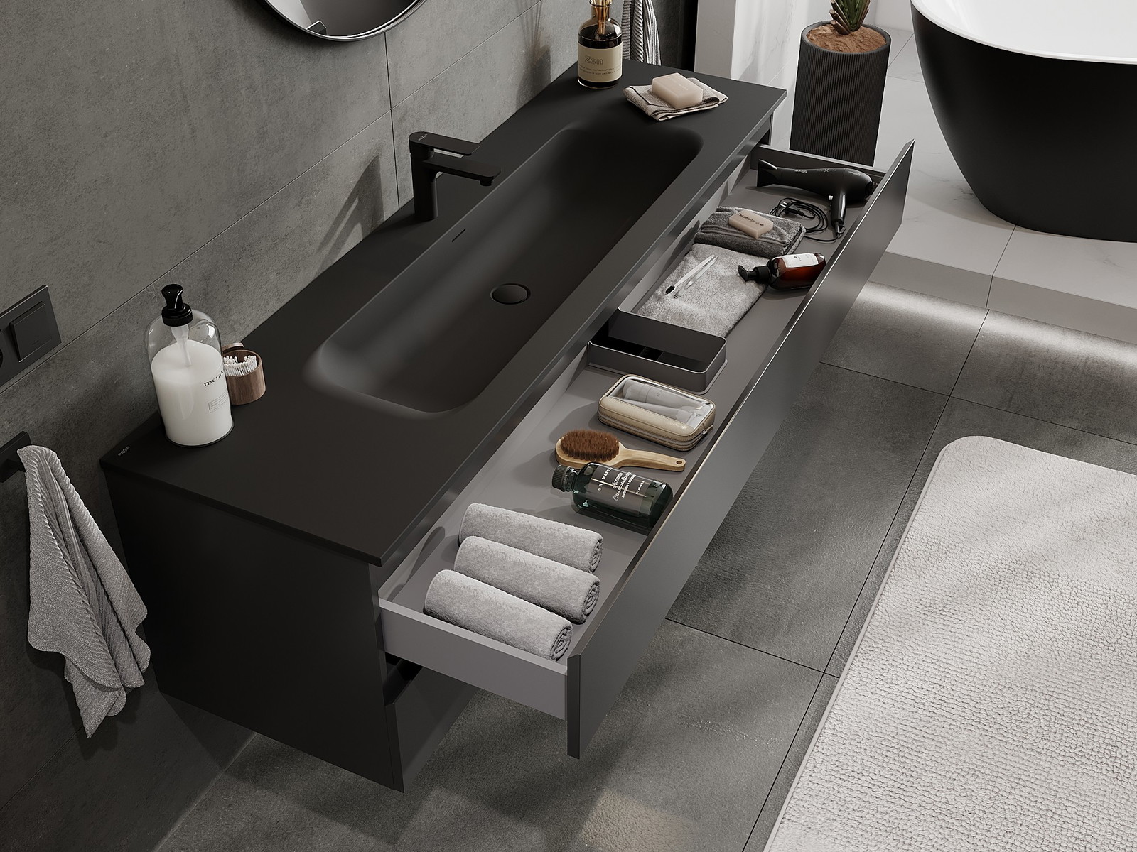 Izgriezums atvilktnē ir veidots tā, lai tajā varētu ietilpt sifons, kas ir nepieciešams izlietņu uzstādīšanā. Pateicoties tam, mēbele var tikt pilnībā funkcionāli uzstādīta, neatstājot ievērojamu vietu atvilktnē instalācijai.