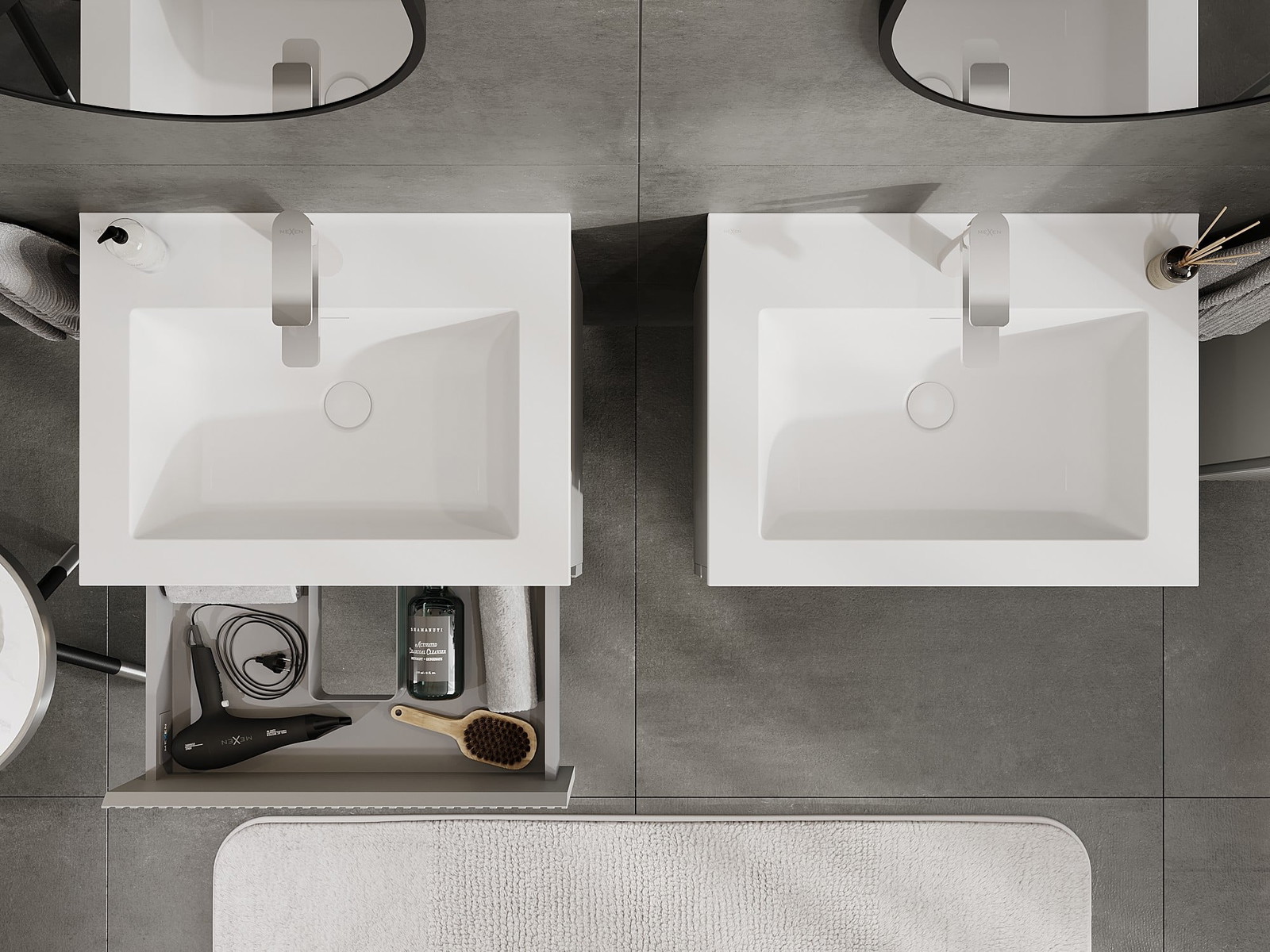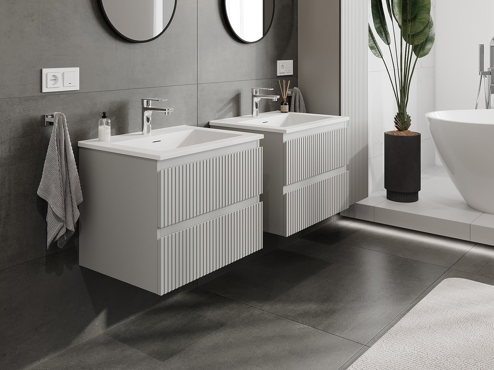 Mexen Rivel 60 cm vannas istabas skapītis ar izlietni Otis, 2 atvilktnes, rievojums, pelēks matēts/balts matēts