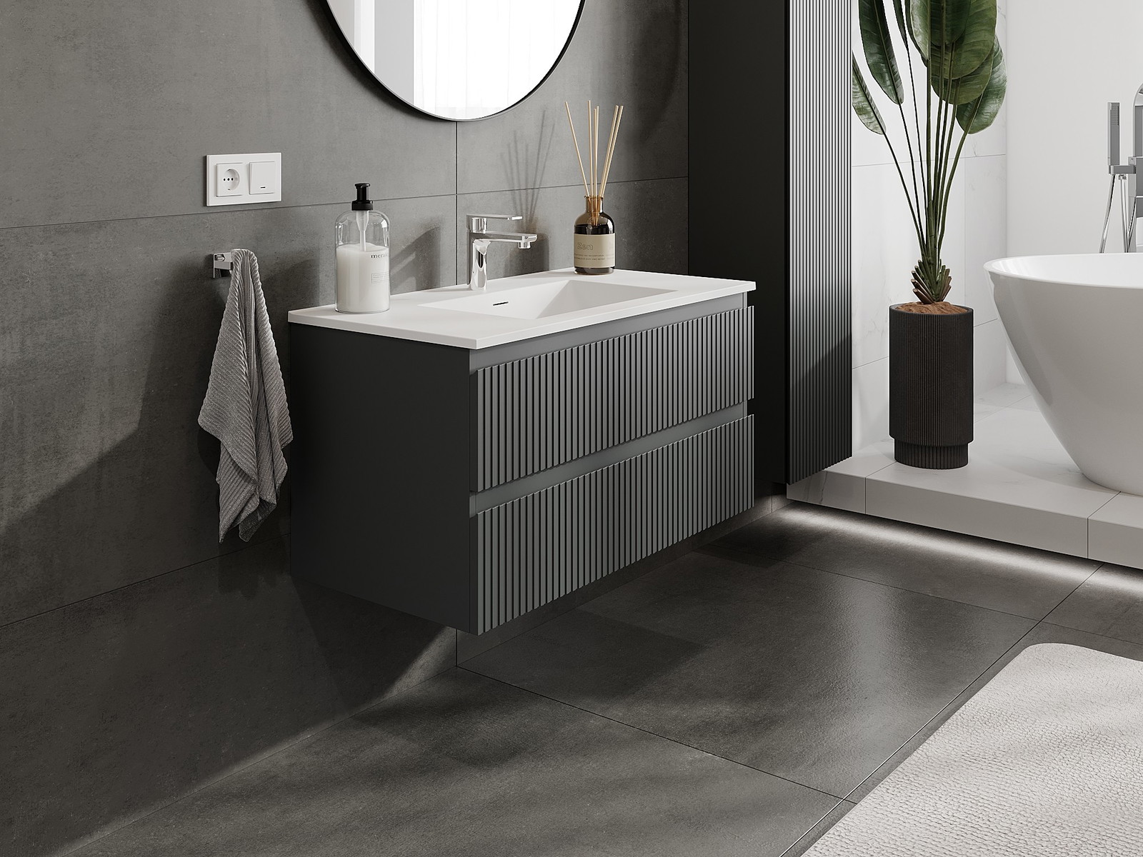 Mexen Rivel 90 cm vannas istabas skapītis ar izlietni Otis, 2 atvilktnes, rievots, grafīts matēts/balts matēts -