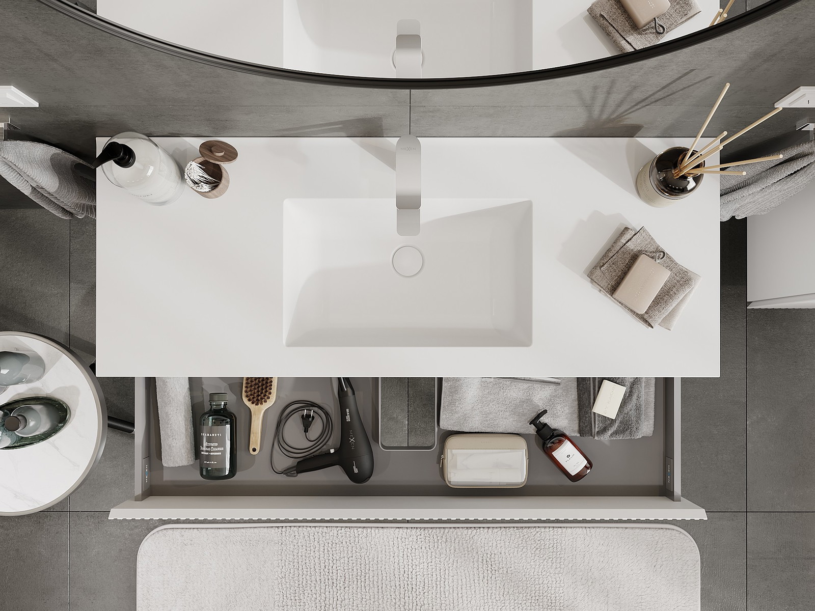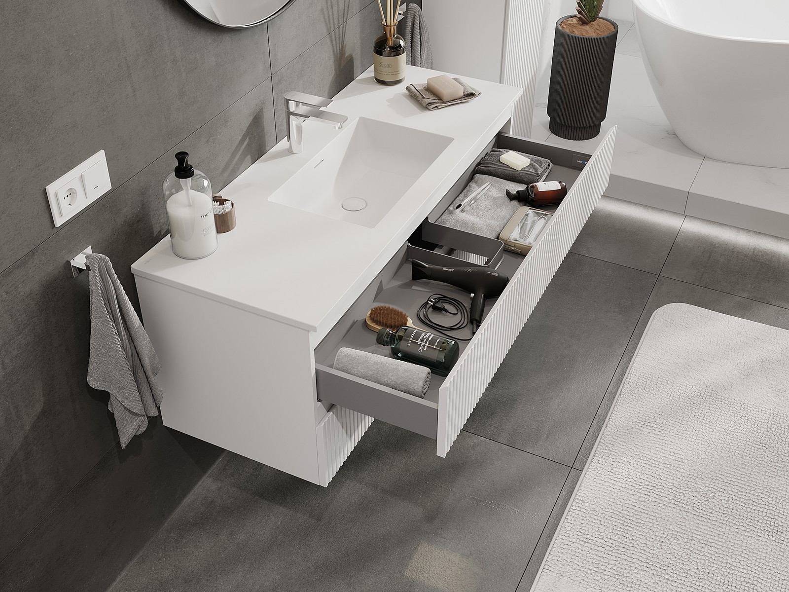 Izgriezums atvilktnē ir veidots tā, lai tajā varētu ietilpt sifons, kas ir nepieciešams izlietņu uzstādīšanā. Pateicoties tam, mēbele var tikt pilnībā funkcionāli uzstādīta, neatstājot ievērojamu vietu atvilktnē instalācijai.