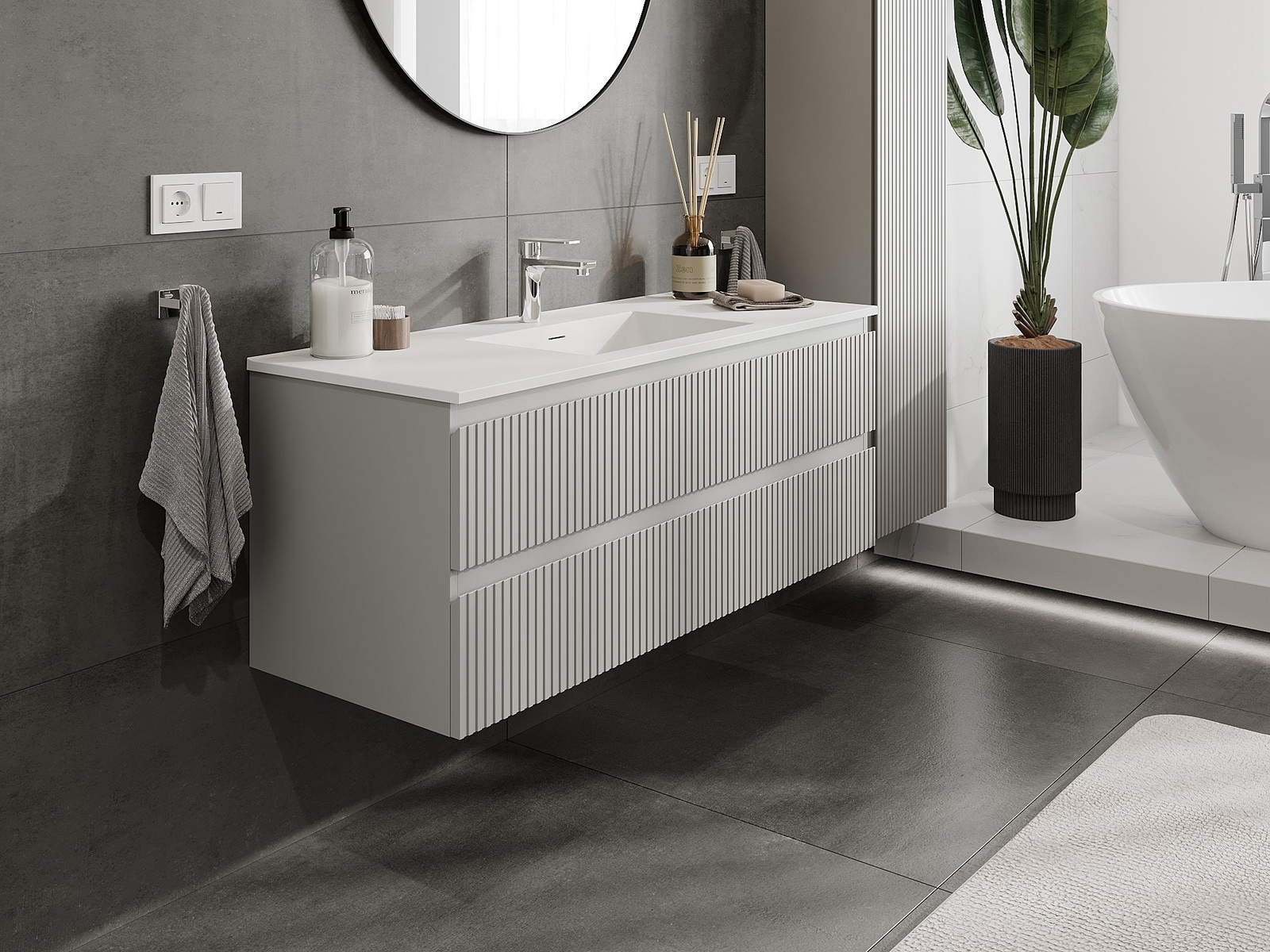 Mexen Rivel vannas istabas skapītis 120 cm ar izlietni Otis, 2 atvilktnes, rievots, pelēks mats/balts mats -