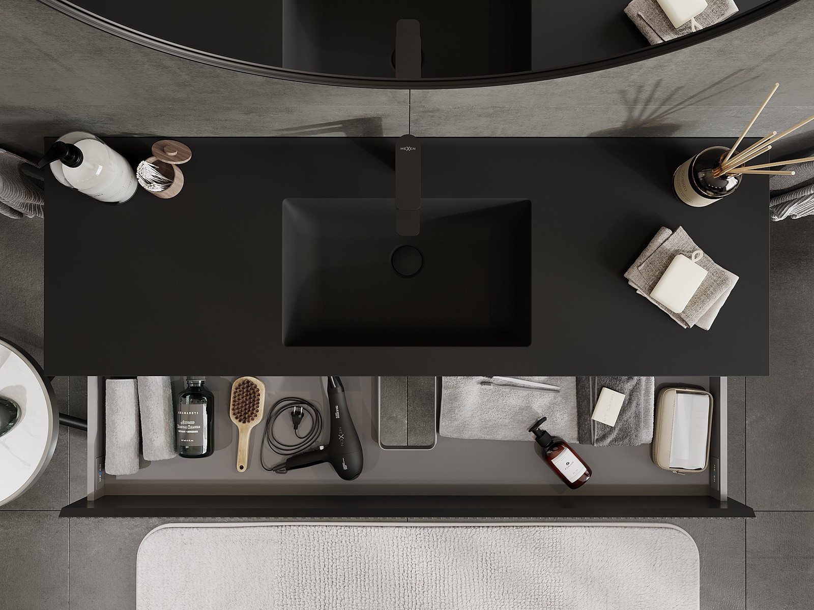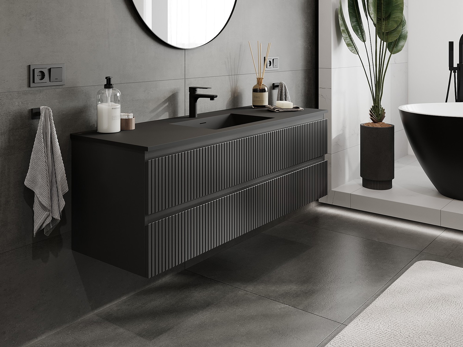 Mexen Rivel vannas istabas skapis 140 cm ar izlietni Otis, 2 atvilktnes, rievots, melns matēts - 91A20-14047-2-BFF71-W18M71