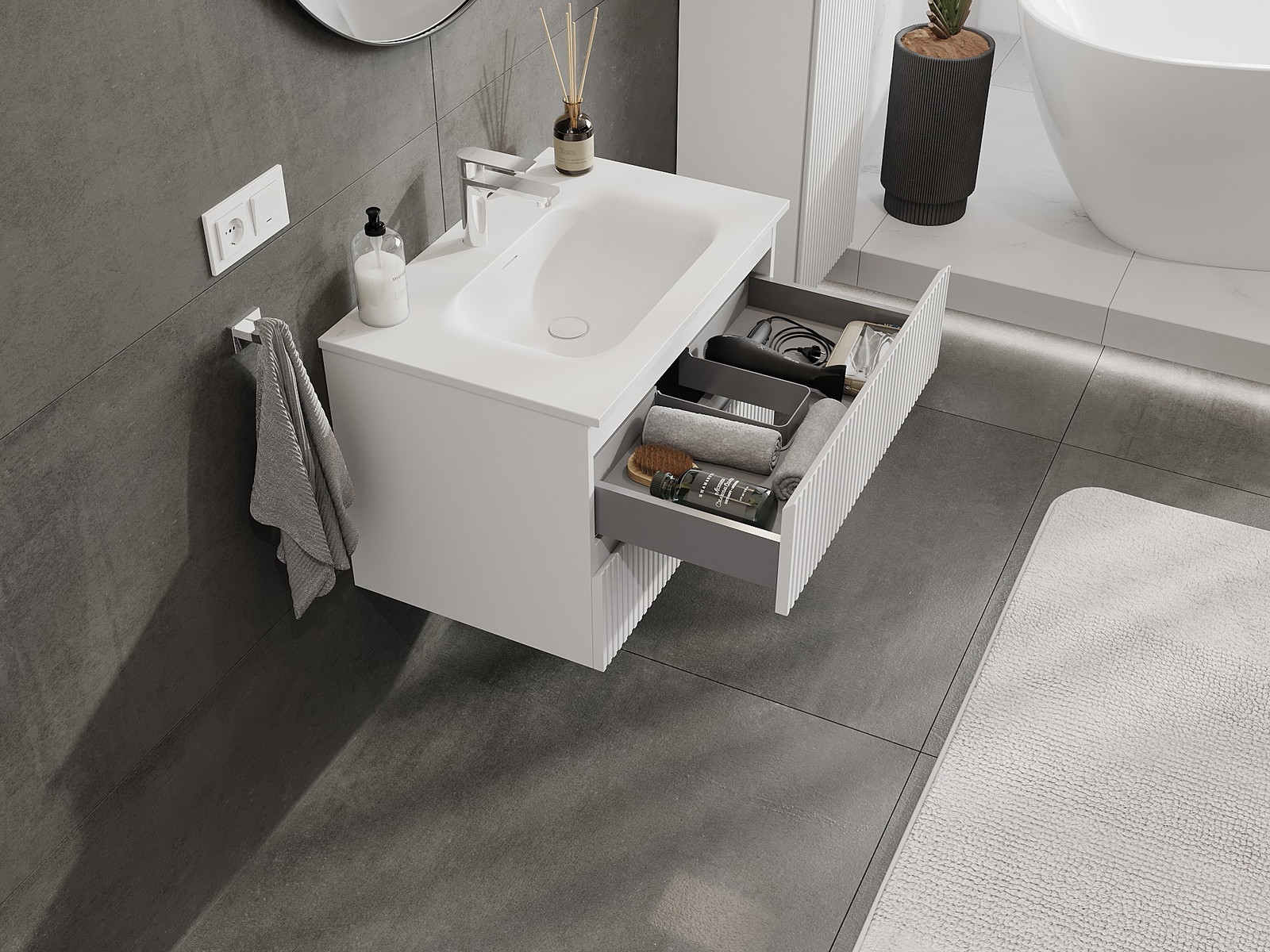 Izgriezums atvilktnē ir veidots tā, lai tajā varētu ietilpt sifons, kas ir nepieciešams izlietņu uzstādīšanā. Pateicoties tam, mēbele var tikt pilnībā funkcionāli uzstādīta, neatstājot ievērojamu vietu atvilktnē instalācijai.