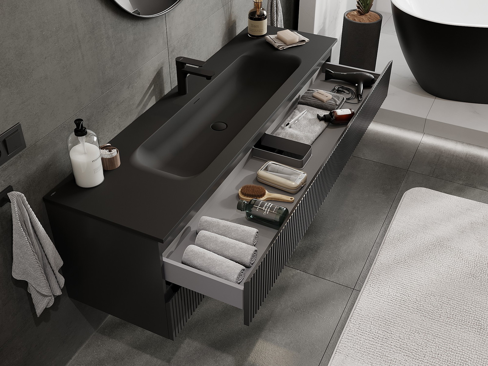Izgriezums atvilktnē ir veidots tā, lai tajā varētu ietilpt sifons, kas ir nepieciešams izlietņu uzstādīšanā. Pateicoties tam, mēbele var tikt pilnībā funkcionāli uzstādīta, neatstājot ievērojamu vietu atvilktnē instalācijai.