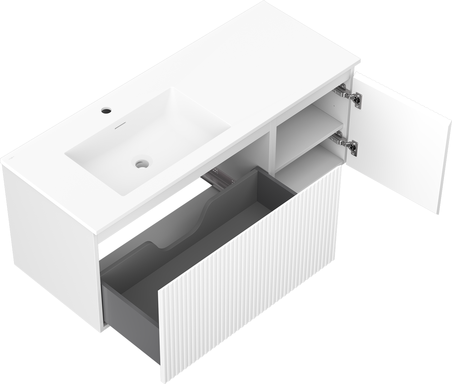 Izgriezums atvilktnē ir veidots tā, lai tajā varētu ietilpt sifons, kas ir nepieciešams izlietņu uzstādīšanā. Pateicoties tam, mēbele var tikt pilnībā funkcionāli uzstādīta, neatstājot ievērojamu vietu atvilktnē instalācijai.