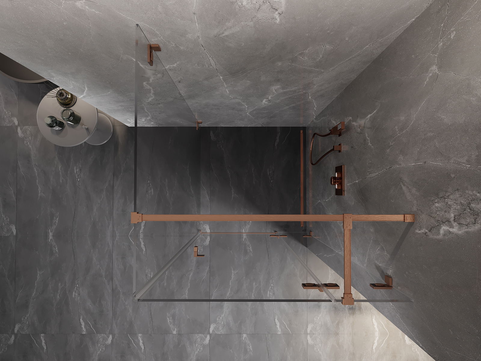 Skavas un eņģes ir izgatavotas no ļoti izturīga misiņa un papildus veido vienā līmenī esošu stikla virsmu. Tas ir lieliska izvēle, kas apvieno eleganci, izturību un modernu dizainu. Šādi risinājumi paaugstina dušas estētiku un vienlaikus atvieglo tīrības uzturēšanu.