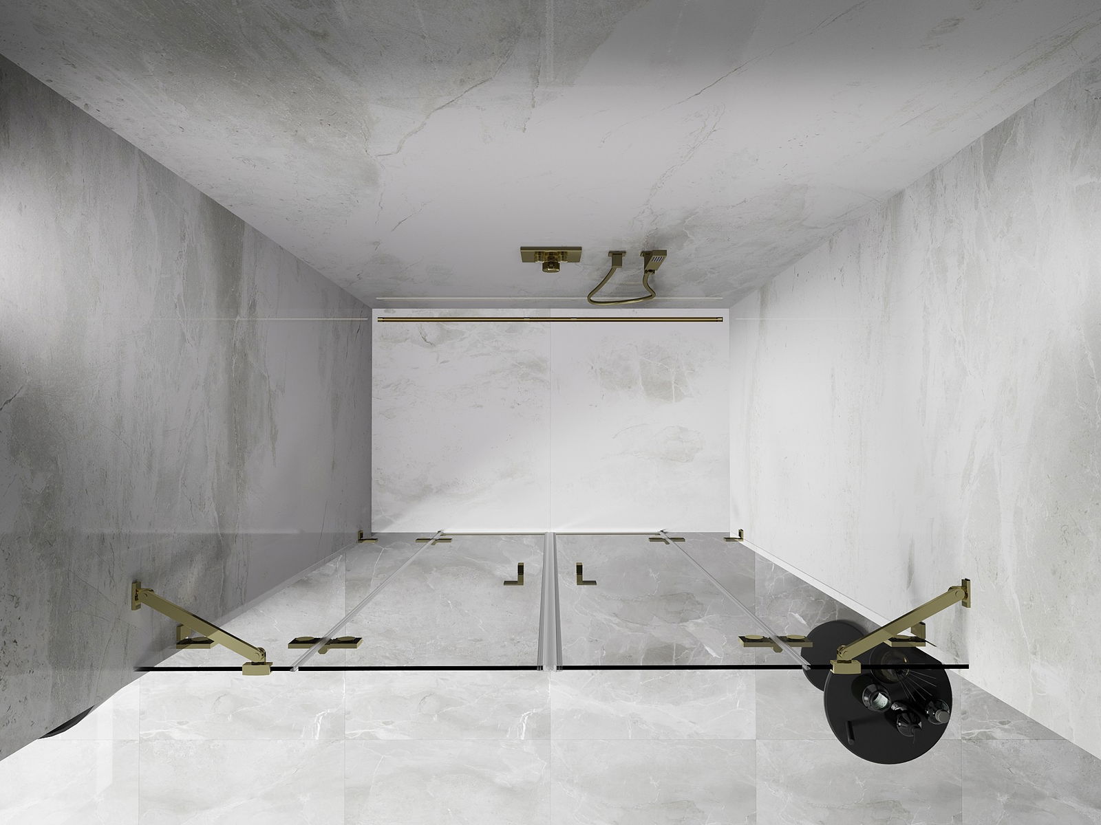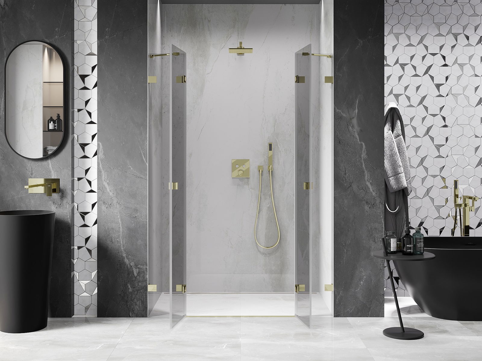 Skavas un eņģes ir izgatavotas no ļoti izturīga misiņa un papildus veido vienā līmenī esošu stikla virsmu. Tas ir lieliska izvēle, kas apvieno eleganci, izturību un modernu dizainu. Šādi risinājumi paaugstina dušas estētiku un vienlaikus atvieglo tīrības uzturēšanu.