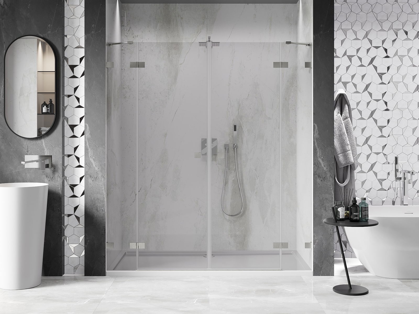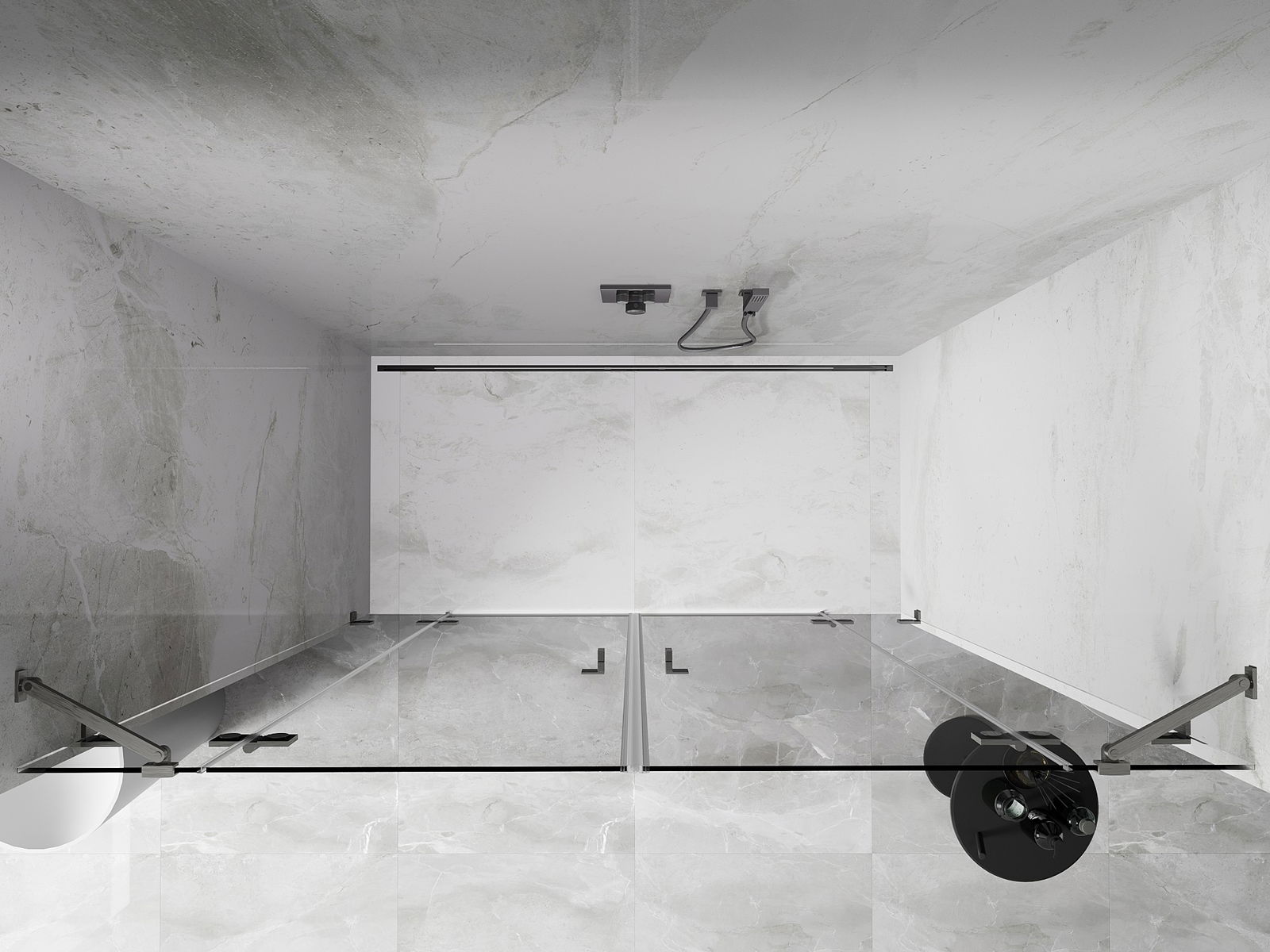 Skavas un eņģes ir izgatavotas no ļoti izturīga misiņa un papildus veido vienā līmenī esošu stikla virsmu. Tas ir lieliska izvēle, kas apvieno eleganci, izturību un modernu dizainu. Šādi risinājumi paaugstina dušas estētiku un vienlaikus atvieglo tīrības uzturēšanu.