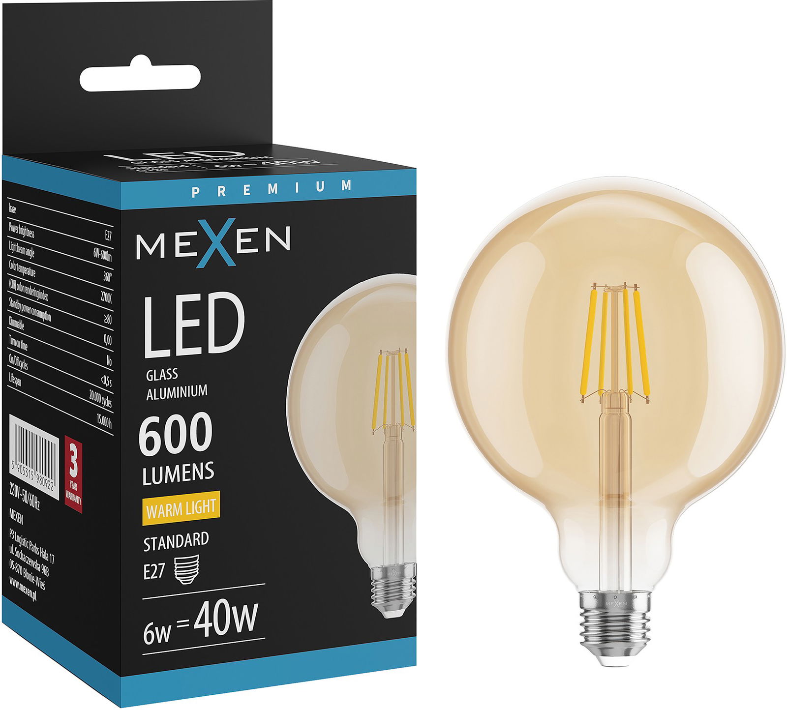 Mexen Vintis LED kvēlspuldze E27, G125, 6W, Silta gaisma - 2700K, 600 lm, dzintara - L158-E27-0627-50