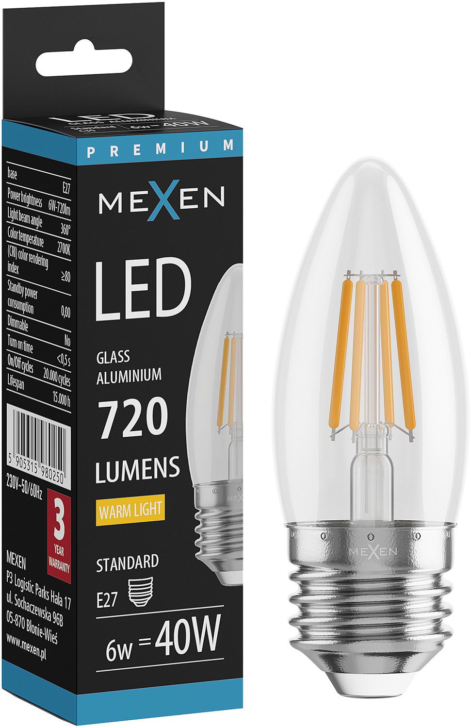 Mexen Vintis Filamenta LED spuldze E27, C35, 6W, Silta - 2700K, 720 lm, caurspīdīga - L154-E27-0627-00