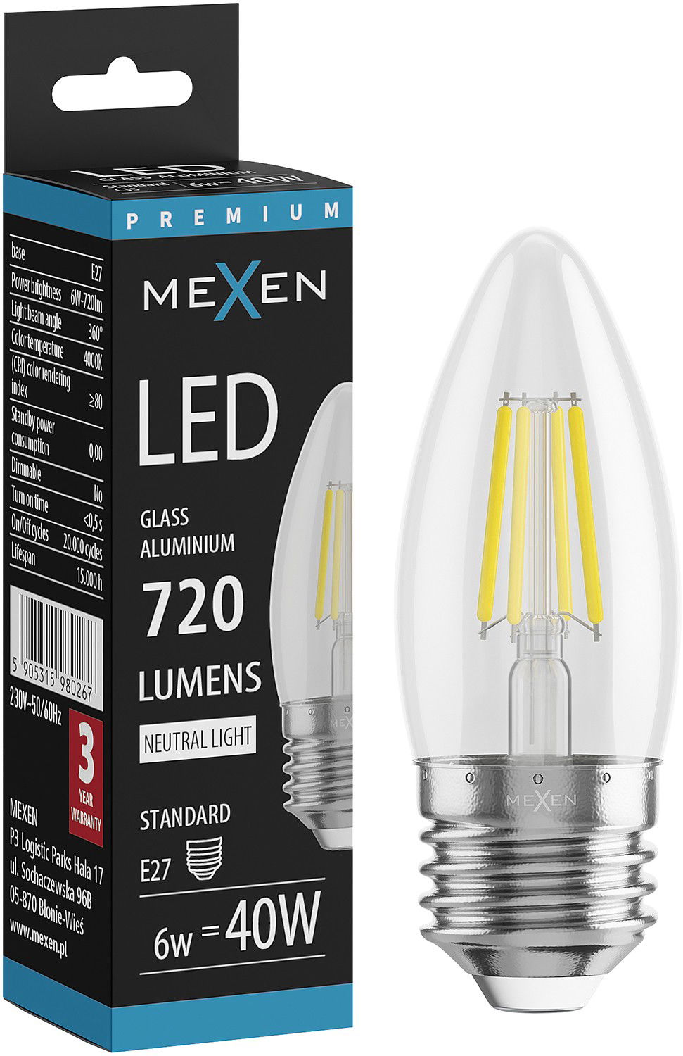 Mexen Vintis LED spuldze E27, C35, 6W, Neitrāla - 4000K, 720 lm, caurspīdīga - L154-E27-0640-00