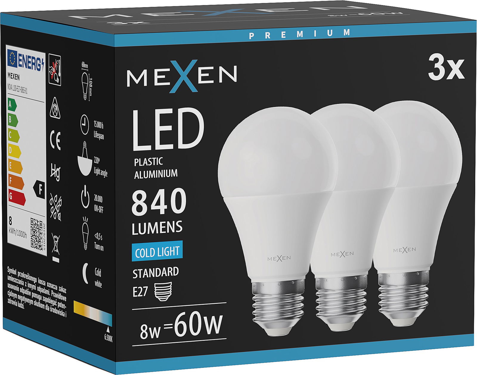 Mexen Nova 3x LED spuldze E27, A60, 8W, Auksts - 6500K, 840 lm - L100-E27-0865-01x03