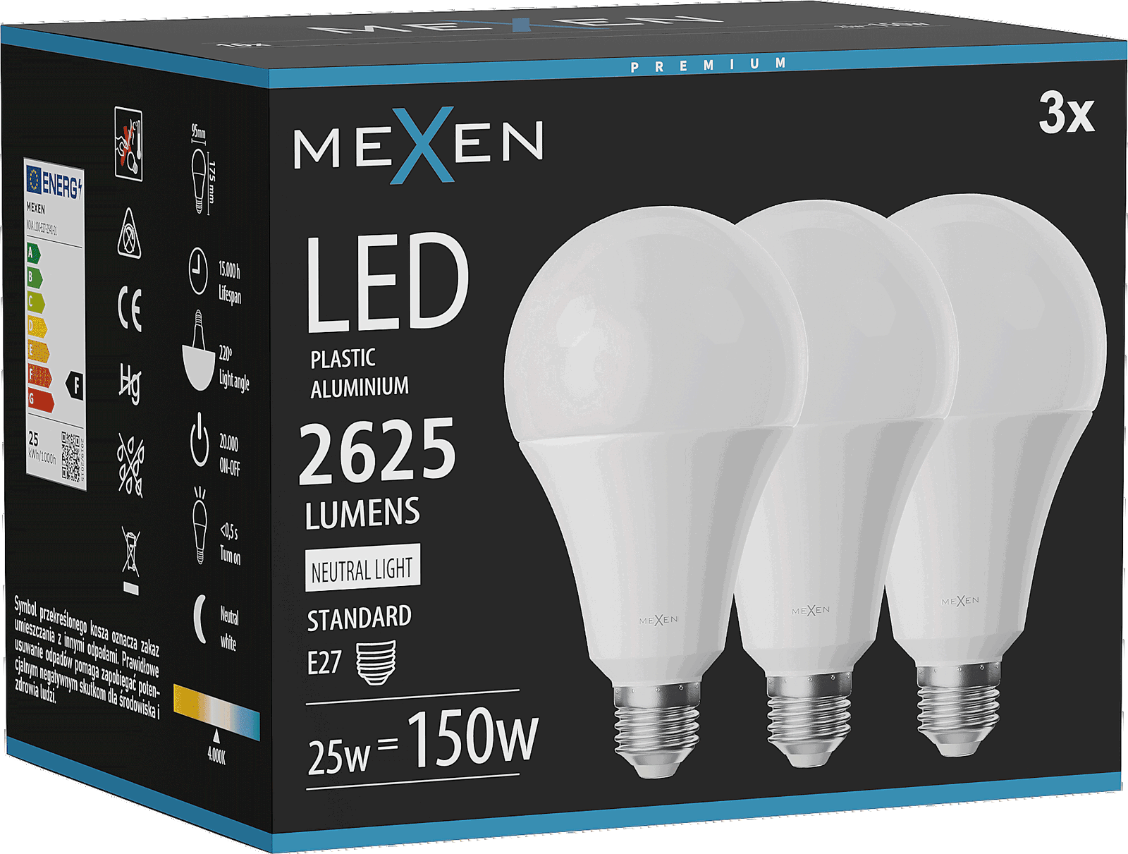 Mexen Nova 3x LED spuldze E27, A95, 25W, Neitrāla - 4000K, 2625 lm - L100-E27-2540-01x03