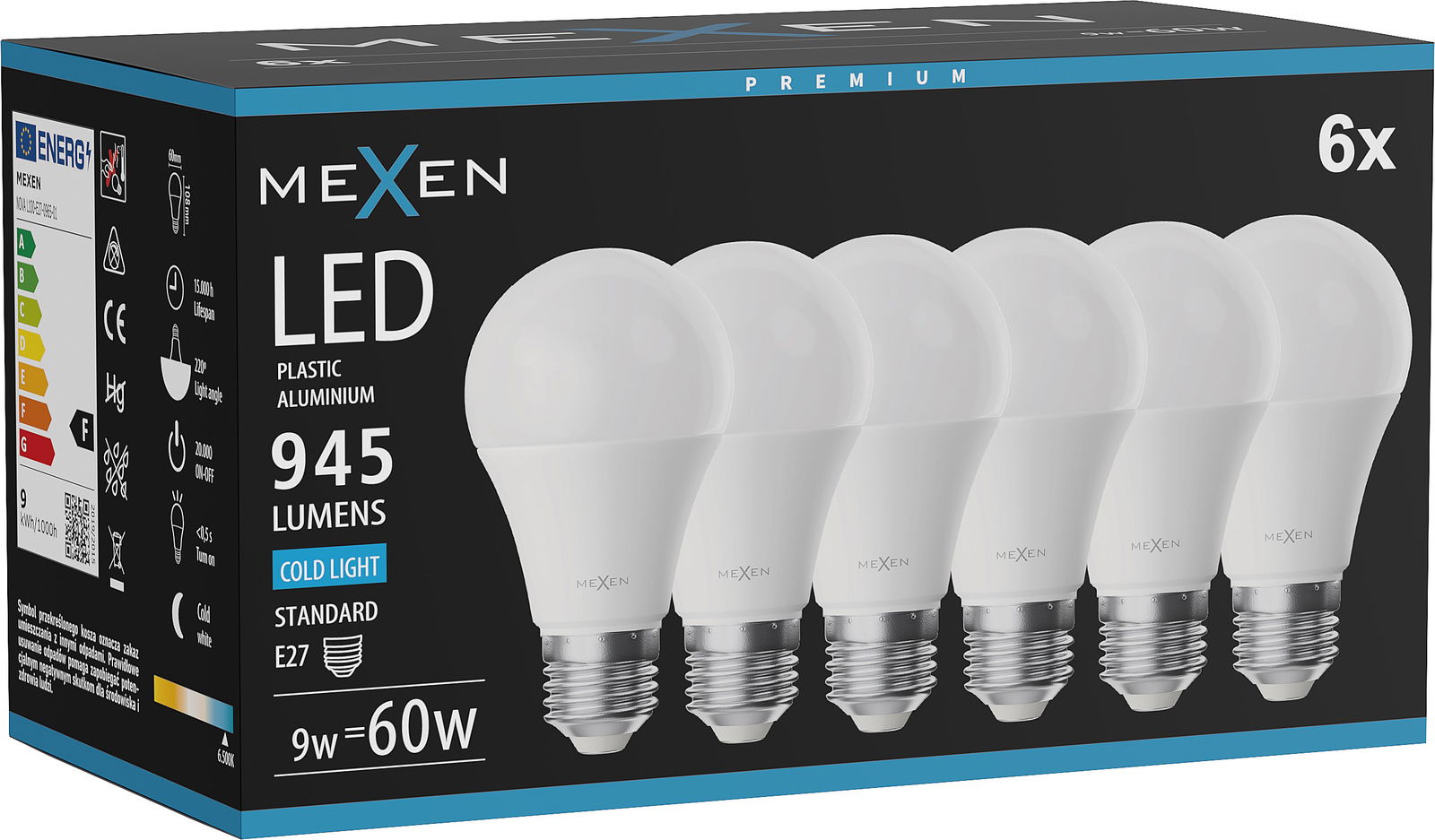 Mexen Nova 6x LED spuldze E27, A60, 9W, Auksta - 6500K, 945 lm - L100-E27-0965-01x06