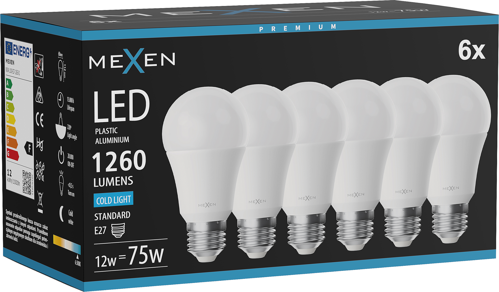 Mexen Nova 6x LED spuldze E27, A60, 12W, Auksts - 6500K, 1260 lm - L100-E27-1265-01x06