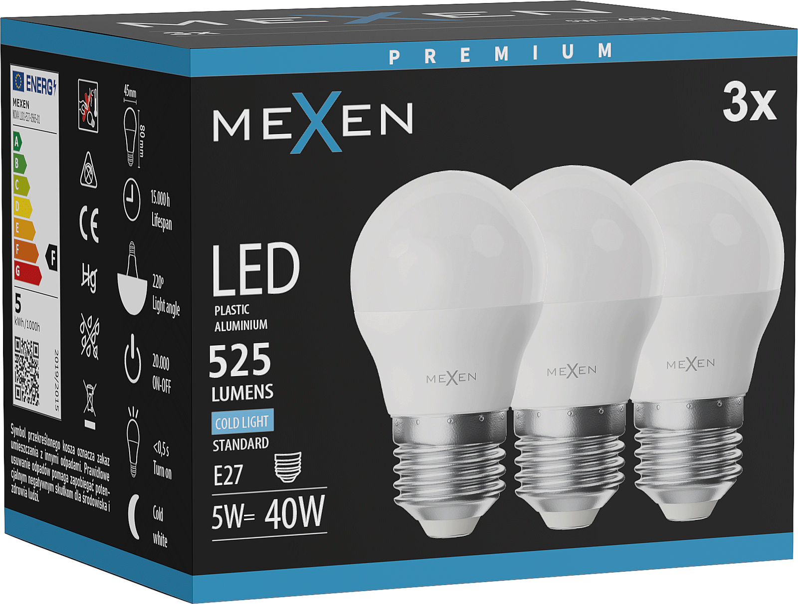 Mexen Nova 3x LED spuldze E27, G45, 5W, Auksts - 6500K, 525 lm - L101-E27-0565-01x03