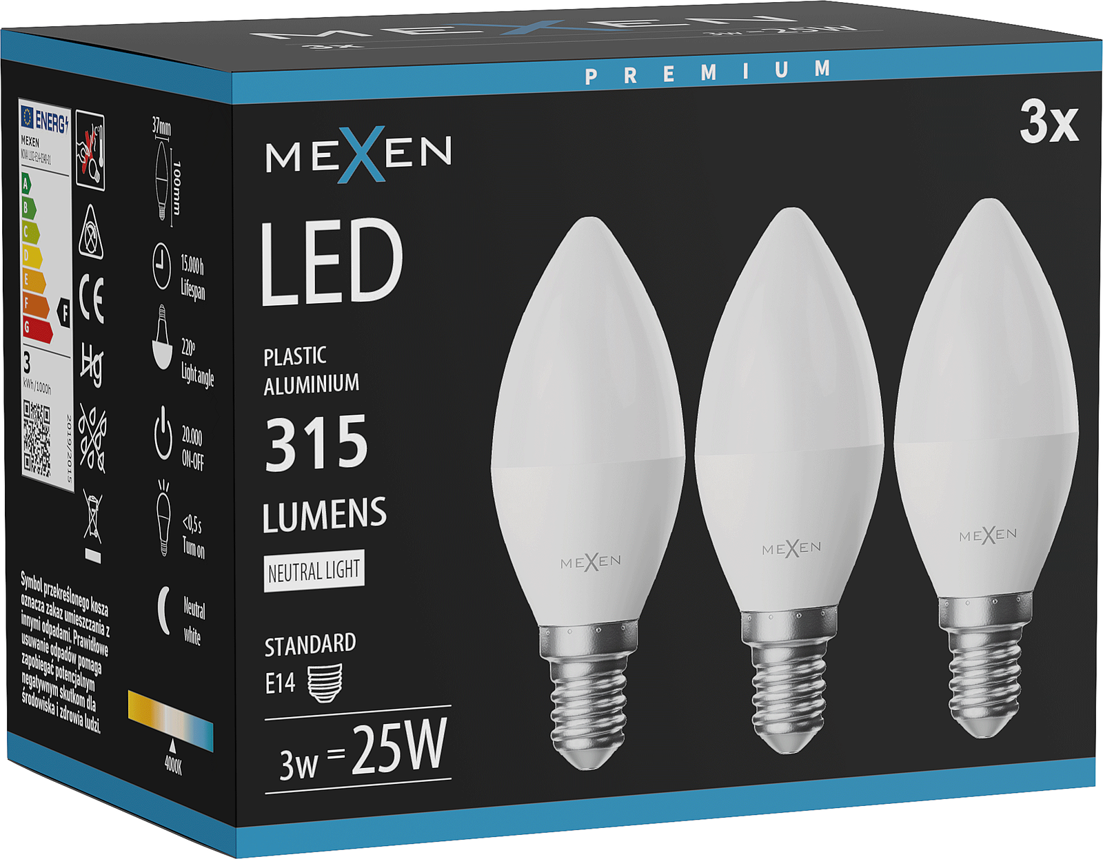 Mexen Nova 3x LED spuldze E14, C37, 3W, Neitrāls - 4000K, 315 lm - L102-E14-0340-01x03