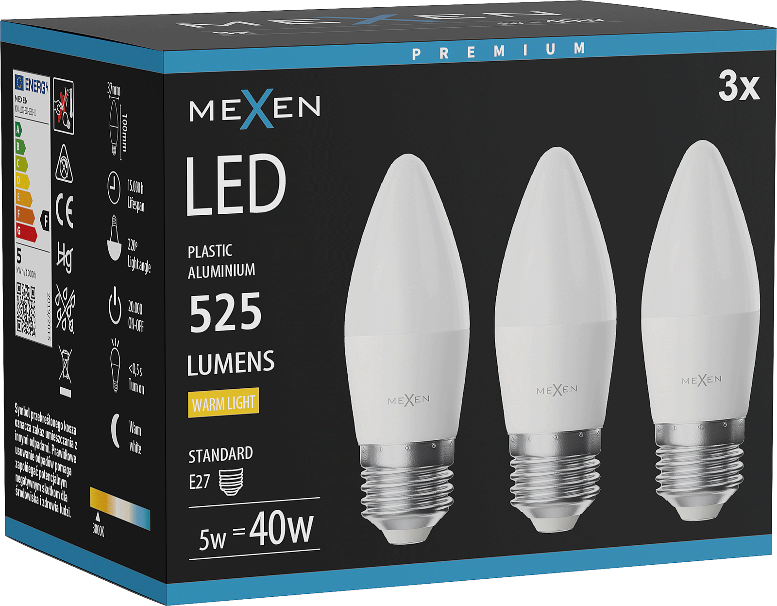 Mexen Nova 3x LED spuldze E27, C37, 5W, Silts - 3000K, 525 lm - L102-E27-0530-01x03