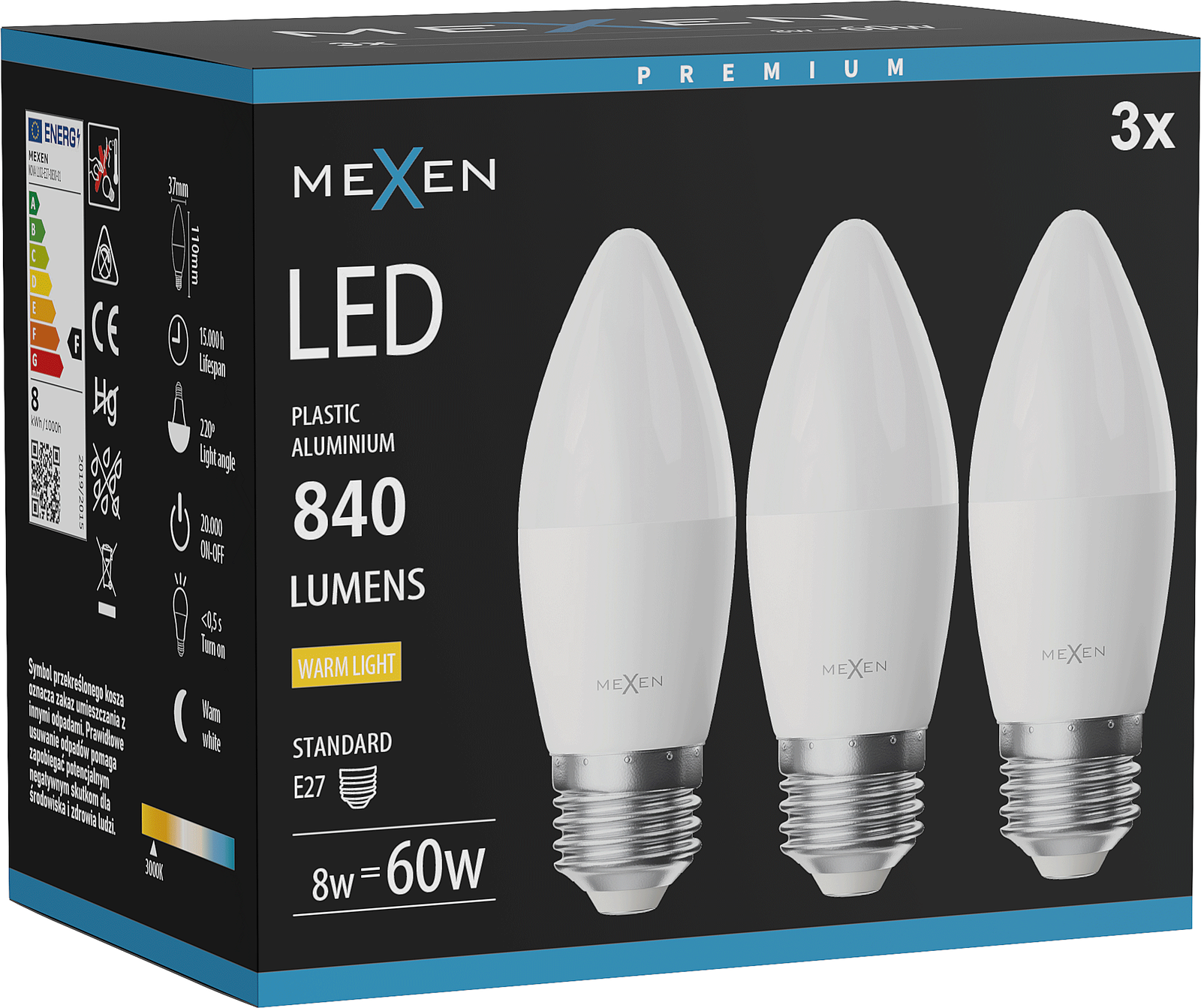 Mexen Nova 3x LED spuldze E27, C37, 8W, Silta - 3000K, 840 lm - L102-E27-0830-01x03