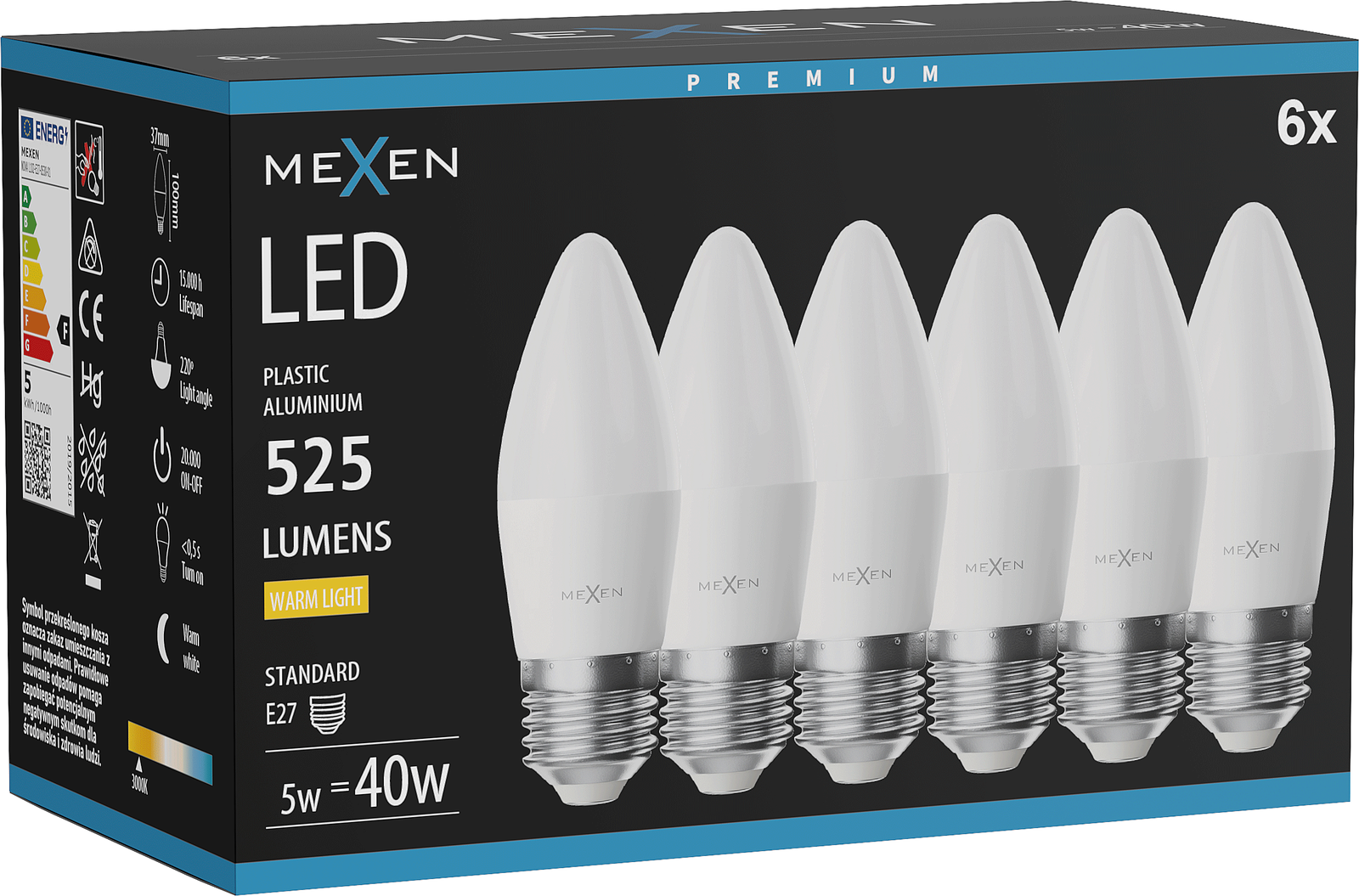 Mexen Nova 6x LED spuldze E27, C37, 5W, Silts - 3000K, 525 lm - L102-E27-0530-01x06