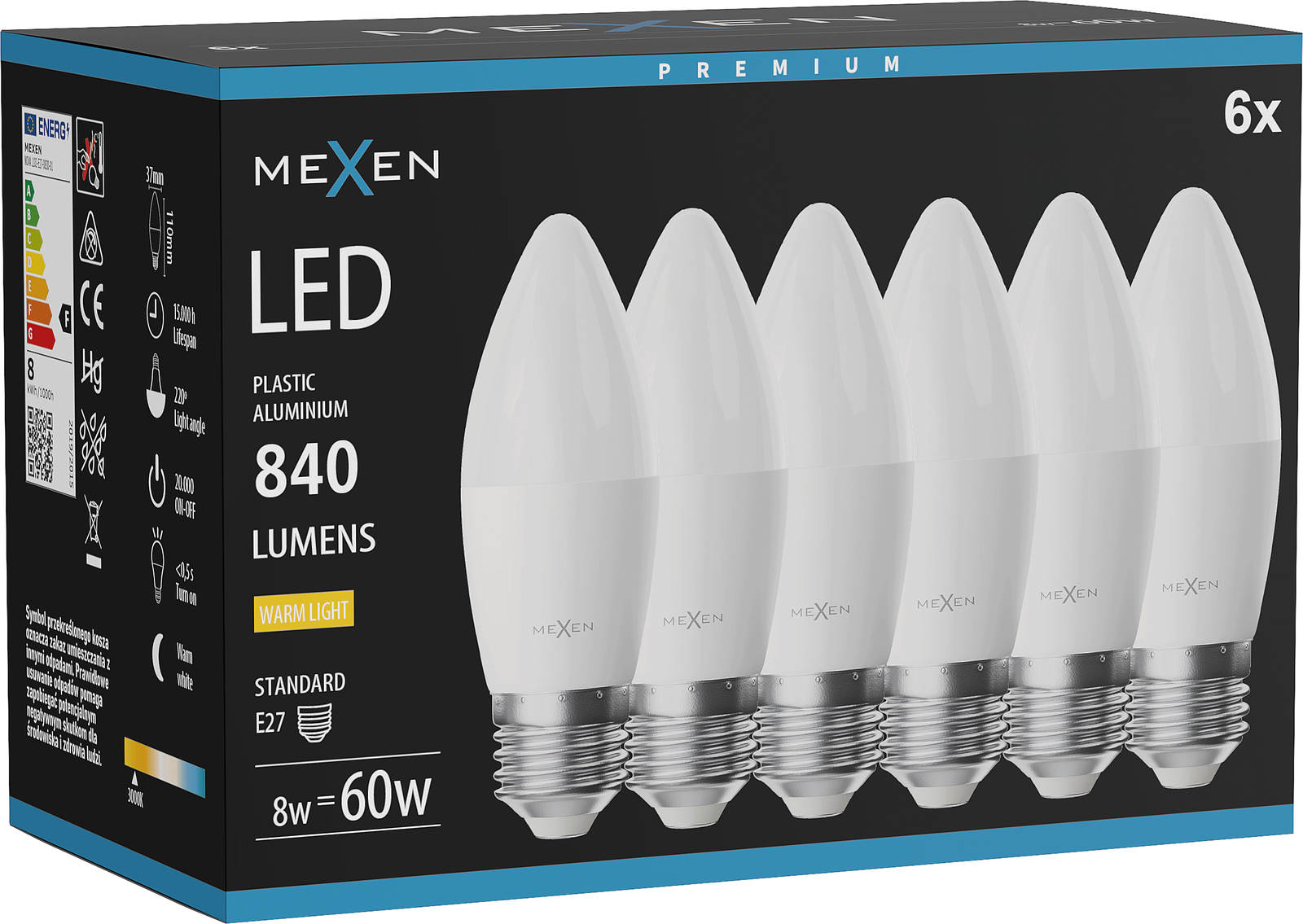 Mexen Nova 6x LED spuldze E27, C37, 8W, Silta - 3000K, 840 lm - L102-E27-0830-01x06