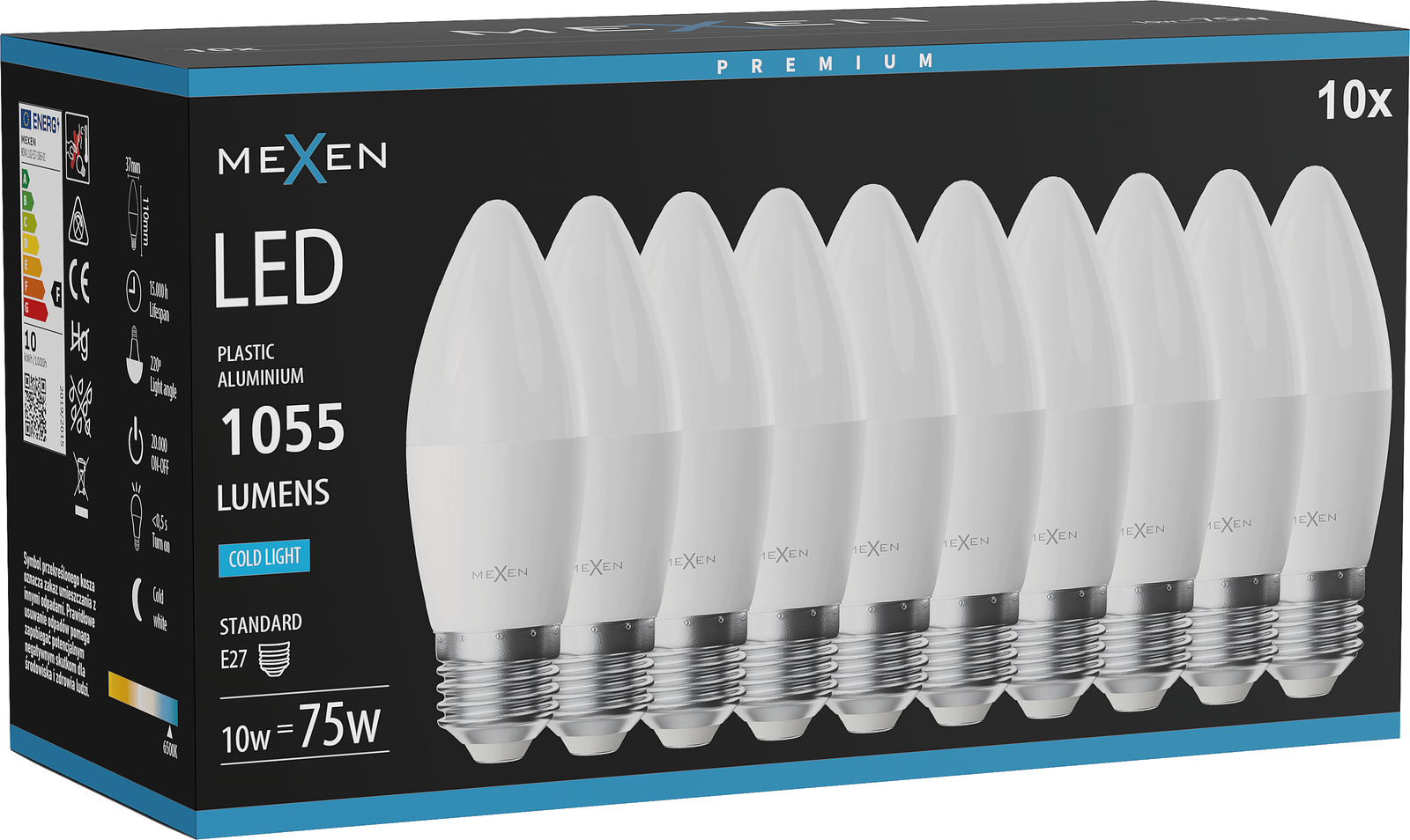 Mexen Nova 10x LED spuldze E27, C37, 10W, Auksts - 6500K, 1055 lm - L102-E27-1065-01x10