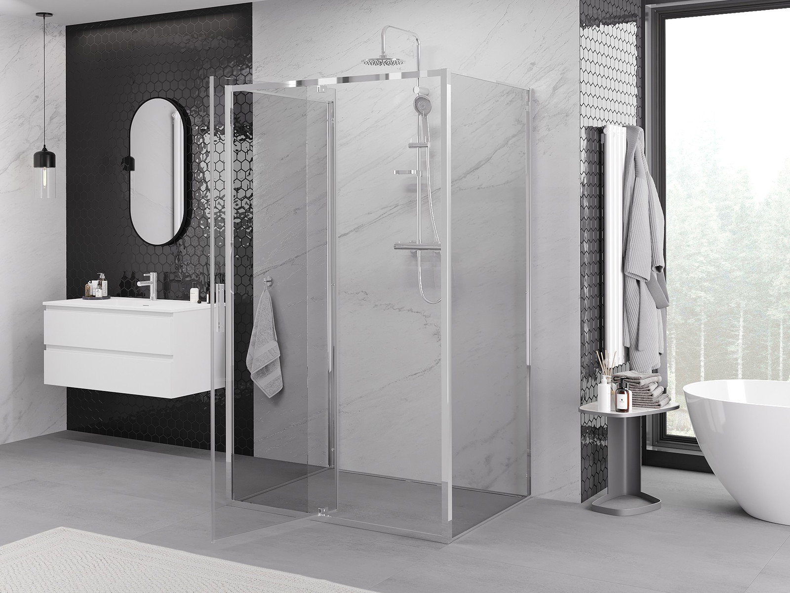 Produktu, atkarībā no vajadzībām, var uzstādīt gan uz dušas paliktņa, gan tieši uz grīdas. Universālā montāžas metode ļauj pielāgot produktu dažāda veida vannas istabām un telpas konfigurācijām.