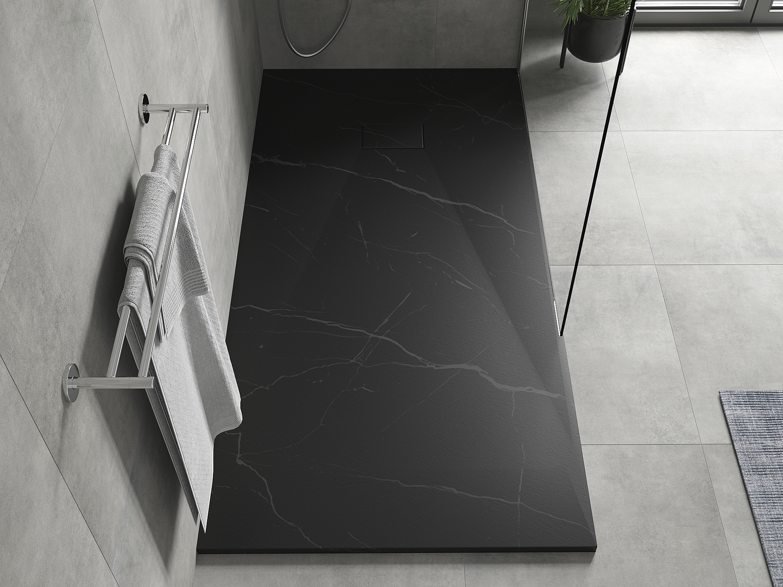 Taisnstūra dušas paliktnis Mexen Hugo apvieno stilu un funkcionalitāti, padarot to par ideālu izvēli modernām vannas istabām. Izgatavots no izturīga SMC materiāla melnā akmens krāsā, garantē maksimālu stabilitāti un triecienizturību. Ultraplāns dizains un iespēja montēt grīdā piešķir eleganci, bet akmens struktūra un unikālais raksts nodrošina izcilu izskatu. Pateicoties pielāgojamībai, dušas paliktnis viegli piemērojas jūsu iekārtojumam. Komplektā ietilpst sifons, kuru var tīrīt no augšas, kas atvieglo apkopi.