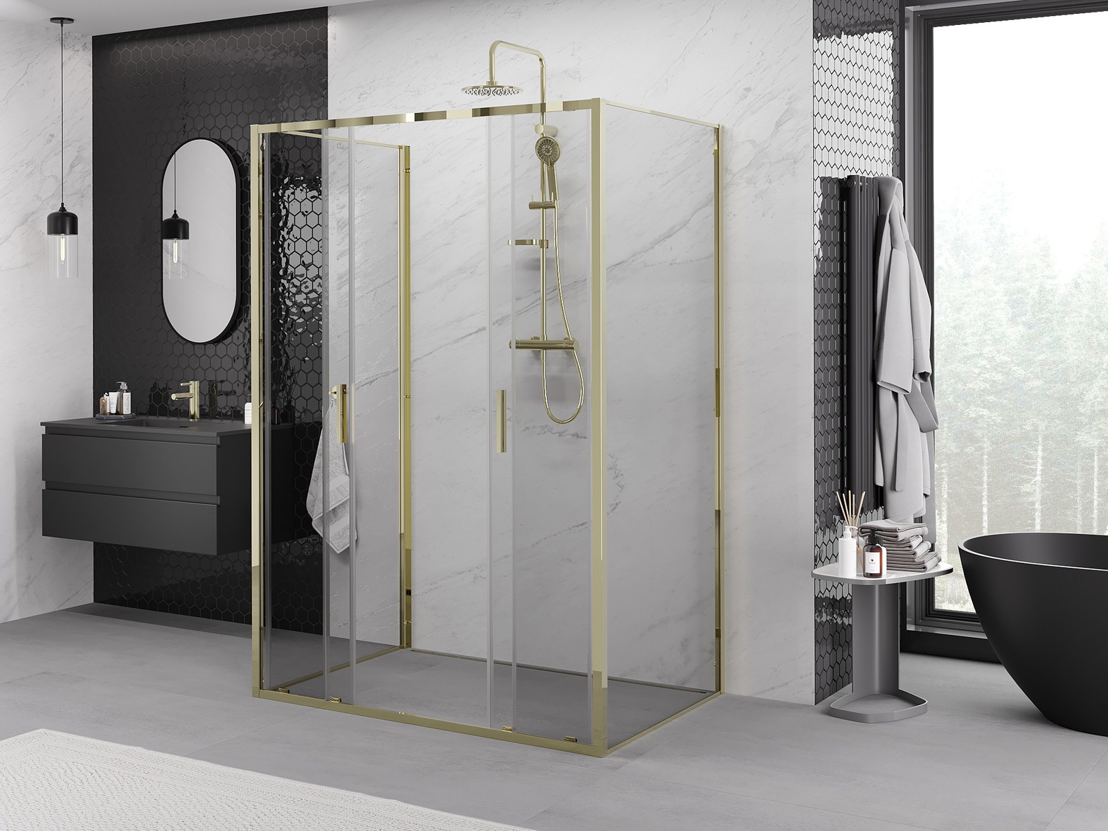 Mexen Exo-3S trīssienu bīdāma dušas kabīne 140 x 85 cm, caurspīdīga, zelta - 8152-140-085-50-00-3S