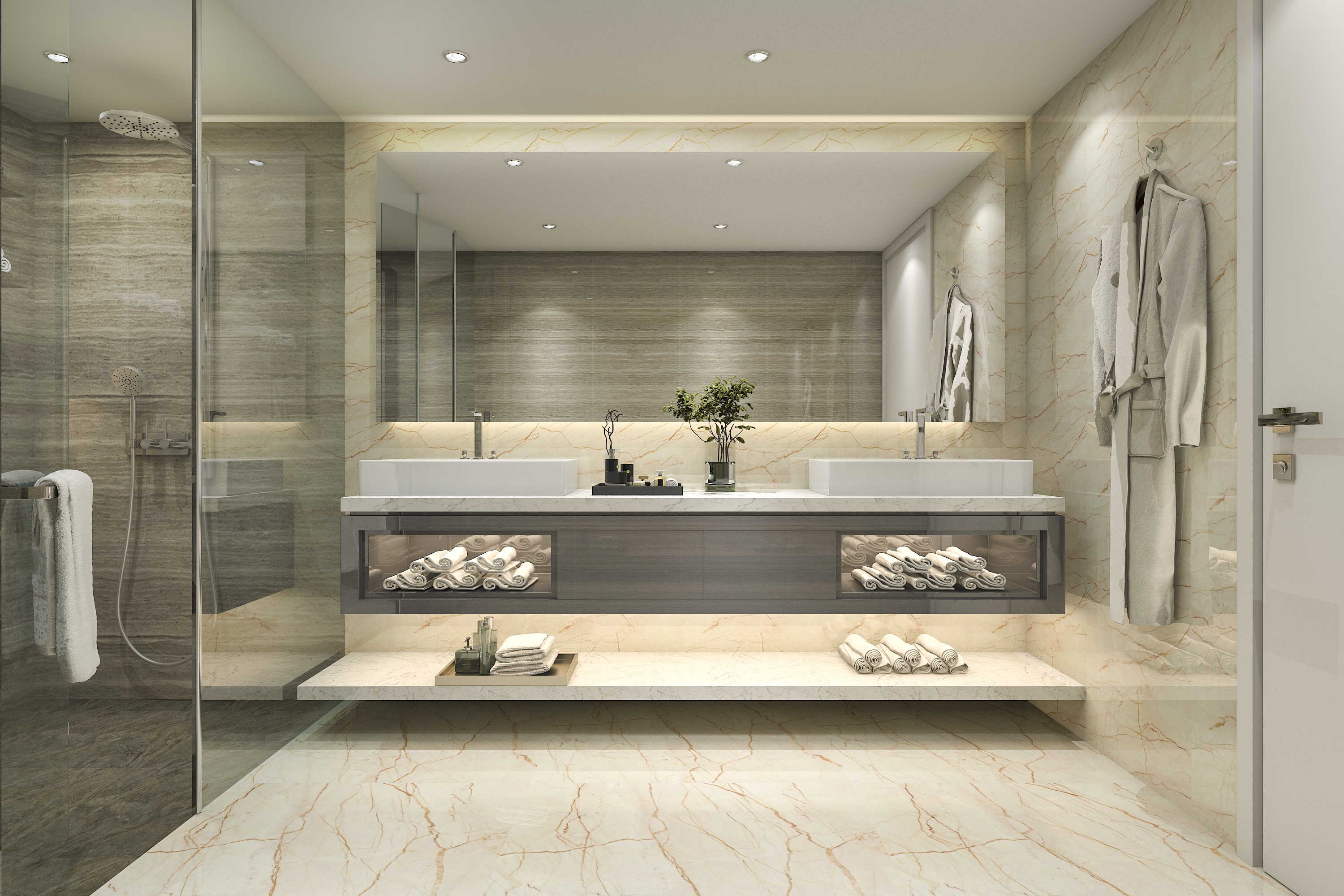 - Apgaismojuma kontrole — LED lentes un citas lampu versijas var pievienot inteliģentajai vadības sistēmai. Izmantojot mobilās lietotnes, varat regulēt apgaismojuma spilgtumu un krāsu, kas ļauj radīt unikālu atmosfēru vannas istabā. Papildus priekšrocība ir arī dimmeri, kas efektīvi pielāgo apgaismojuma intensitāti jūsu vajadzībām.