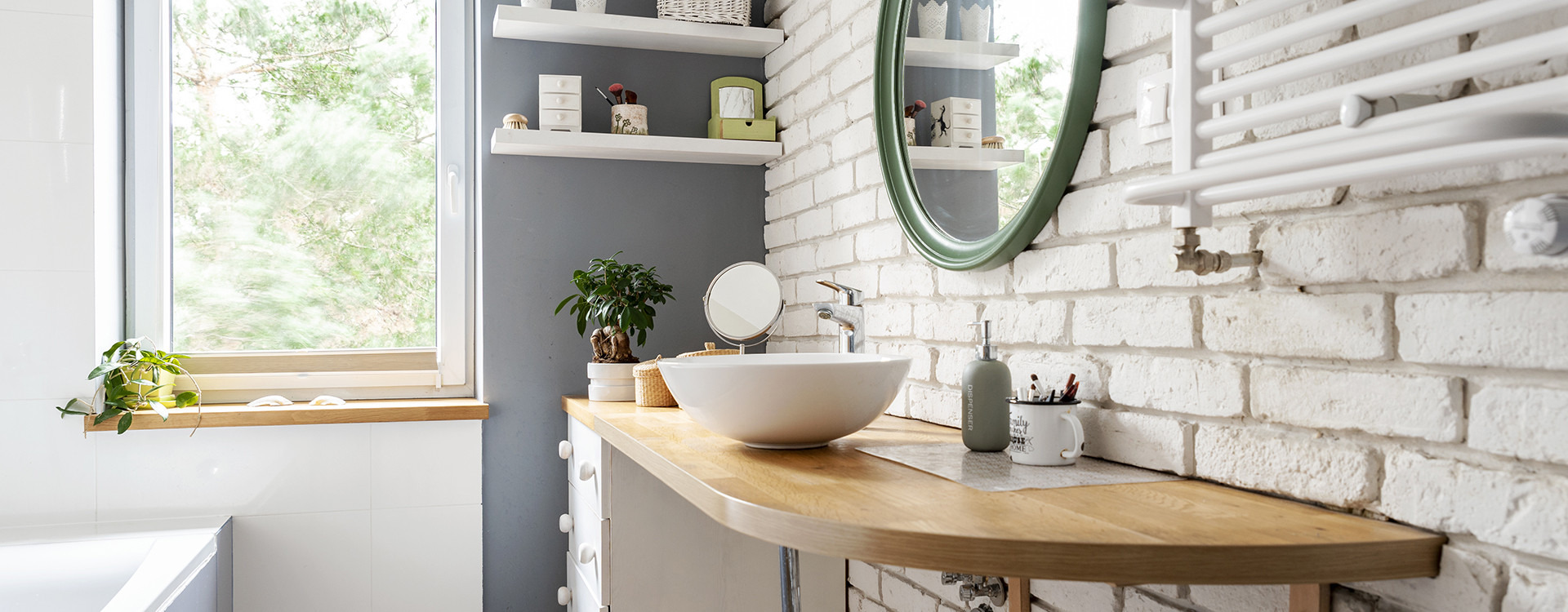 Cits veids, kā paspilgtināt mūsu skandināvu vannas istabu, ir ķieģelis – neapstrādāts vai balināts. Šo elementu var arī iegūt, izmantojot imitācijas, ko dod šajā formā izgatavotās keramiskās flīzes.